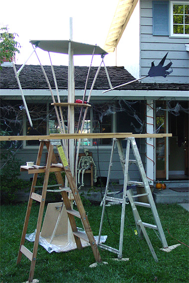 Aku moved to front of house. My makeshift scaffold in front of the Aku framework. PVC arms and foam-core hand are now applied.