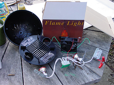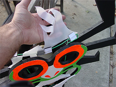 Taking apart a silk flame cauldron to create "fire" above Aku's eyes. Silk flame pieces are loosely attached to wire mounted behind face panel.