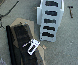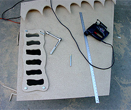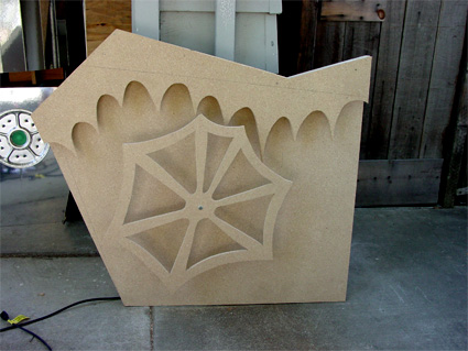 Shown below is another detail of the machine: an indicator faceplate. No machine would be complete without flashing indicators, and these panels were designed to act as gothic faceplates for the machine's lights. After cutting out the forms, I stapled plastic screen material to the backs to diffuse the bulbs that would appear behind them. These faceplates were then painted and attached to the machine with large bolts to add to the industrial "heaviness" of the appearance.