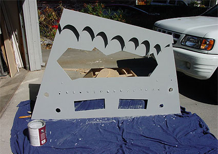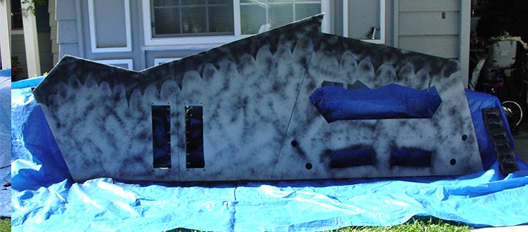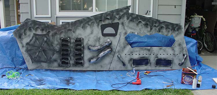 Paint time... Now that I had all the pieces built, it was time to make the machine appear weathered. I used a combination of grey floor paint (just in case it rained) and black spray paint. Once the grey had dried, I sprayed black across the face in random directions to make the finish look as organic as possible. Then the detail elements were applied: faceplates, web wheel, pipes, grills, meter, etc. The machine was finally starting to come together.