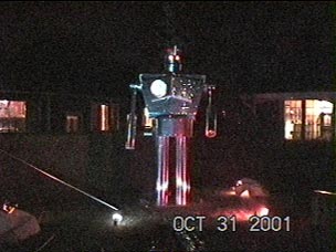 Trick-or-Treaters would walk half way toward the house, stop, and watch the robot for a minute or so, causing people to back up in lines waiting to get to our front door. We really had no idea what to expect in the way of numbers due to the terrorist events of September 11, but the turnout was great. Visitors offered all manner of positive comments and thanks (when does anyone ever THANK you for decorating your house?). Parents ushered their kids onto the lawn to get pictures near the "giant". Questions were repeatedly asked: "Did you make this?" "How long did it take you?" "How did you make it move?" "Why did you do this?"