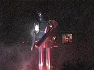 Shown here are some stills from video shot Halloween night. The robot was positioned facing the walk leading up to our front door, and lit with floodlights on the ground. I had a fog machine positioned behind the robot's legs to waft smoke into the air, giving the scene more "realism". The lighting from the robots eyes, chest and arm would send beams of light through the haze, making for a fairly impressive display. But what really got people excited was the movement.